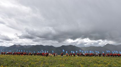 花海上、馬匹間,康巴漢子摩拳擦掌;藍(lán)天下、溪流旁,盛裝觀眾搖旗吶喊。19日,作為運(yùn)動會的分項(xiàng)活動之一,德差鄉(xiāng)羊格貢草原上演了一場500匹駿馬在康巴漢子駕馭下同場飛奔的馬術(shù)表演視覺盛宴。伴隨著鏗鏘有力的馬蹄聲、駿馬的嘶鳴聲和觀眾的歡呼聲,一幅集奔騰之美、力量之美、風(fēng)光之美于一體的壯美畫卷快速閃過觀眾眼簾。