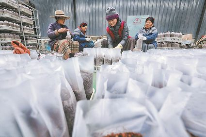 2021年新年伊始,甘孜州的氣溫已經(jīng)降到了零攝氏度以下。1月5日,位于雅江縣八角樓鄉(xiāng)松茸村的松茸產(chǎn)業(yè)園菌種菌包廠房里卻是熱氣蒸騰,數(shù)十位工人正有條不紊地往菌種架上放置菌包。很快,3米多高的鐵架上就密密匝匝的堆滿了制作好的菌包。廠房的旁邊就是食用菌存儲冷庫,各類食用菌在這里進(jìn)行分揀、定級、包裝。十多個(gè)小時(shí)后,經(jīng)物流車送出的一箱箱食用菌產(chǎn)品就會出現(xiàn)在省內(nèi)外各大超市的生鮮貨架上,市民在千里之外也能嘗到大山里的味道。
