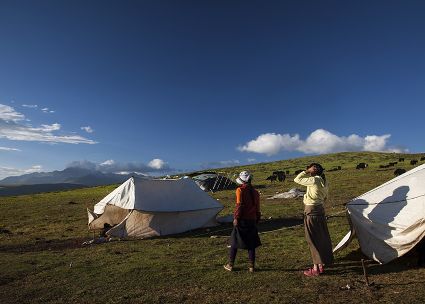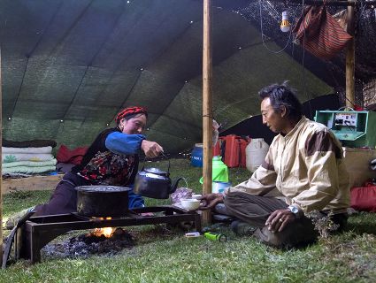 悄然而至的晨曦,隱藏著太古未盡消遁的光芒。揚天的旌旗纏成不倒的箭桿,曾經(jīng)的故事還沒走出夢中。草原的安謐,輕輕地?fù)嵛恐届o的牛群。奶香已浸漫晨的清新中,擠奶的姑娘臉頰已鍍上了紅霞的光暈。天地間的沉靜,只等待著第一聲牛哞的響起……草原的清晨,朝陽光臨的一刻,酥油和奶汁的淳香會醉倒那一片草色碧透的天地。