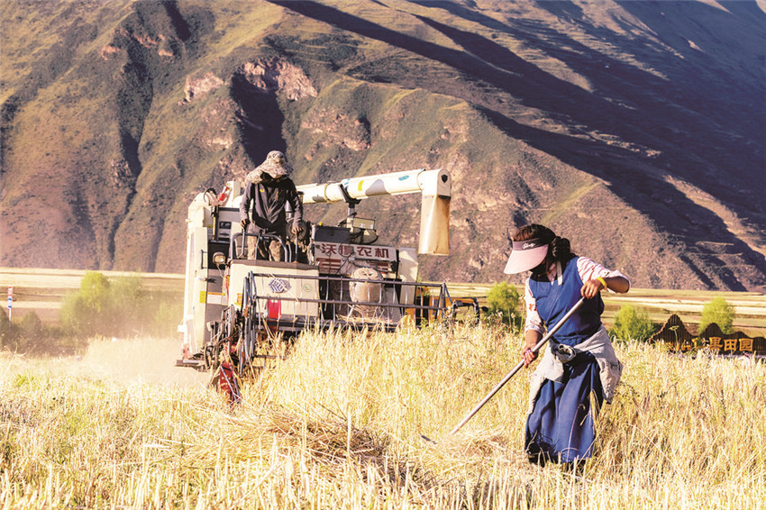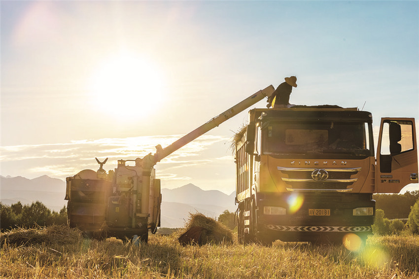 甘孜縣是我州的農(nóng)業(yè)大縣,也是全國(guó)青稞商品糧基地之一,素有“康北糧倉(cāng)”的美譽(yù)。日前,在甘孜縣仁果鄉(xiāng)青稞收割現(xiàn)場(chǎng),一望無(wú)垠的田地里麥浪滾滾、麥香四溢,一臺(tái)臺(tái)聯(lián)合收割機(jī)在金色的青稞地里來(lái)回馳騁,時(shí)不時(shí)停下來(lái)“吐出”金燦燦的青稞,農(nóng)戶們的臉上露出豐收的喜悅笑容。