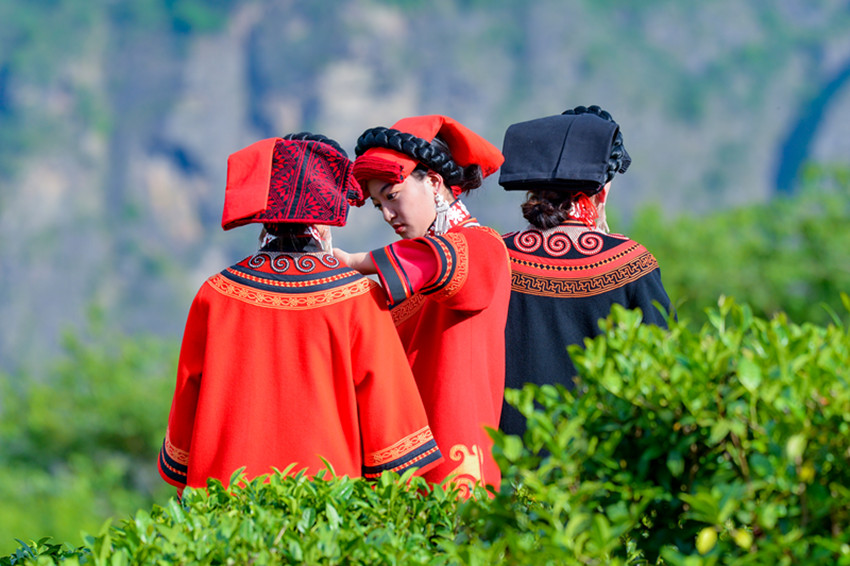 三五成群,戴笠攜籃。茶田之間,普米漢子,
