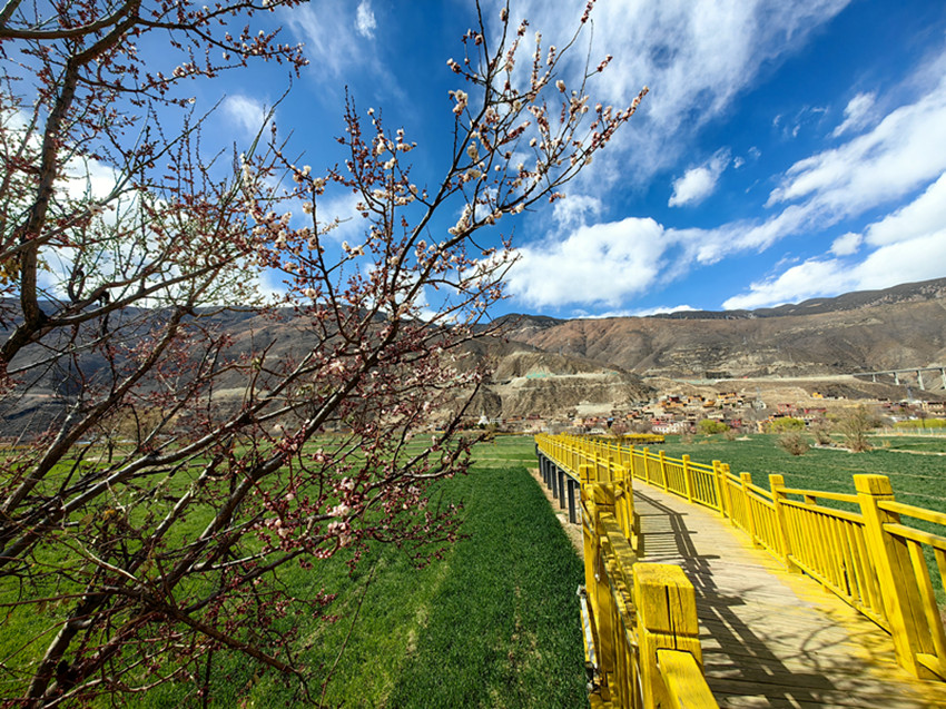 春意枝頭俏,桃花競相開。登高遠(yuǎn)望,巍峨青山綿延,山腳麥苗蕩漾,蒼茫山色間,一株株、一叢叢野生桃花星羅棋布點綴其間,加之一棟棟別致藏房掩映其中,春的美麗畫卷就此鋪展開來。