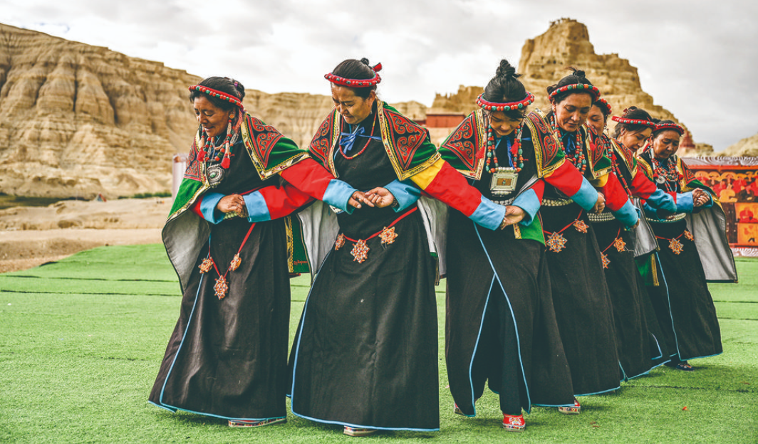 “宣舞”起源于札達(dá)縣,是西藏阿里民間傳統(tǒng)舞蹈?!靶琛比诤喜貞颉⑽璧?、說(shuō)唱等主要的藏民族民間藝術(shù),內(nèi)容涵蓋藏民族宗教、禮儀、風(fēng)俗、節(jié)慶等各方面的內(nèi)容。2008年,“宣舞”入選第二批國(guó)家級(jí)非物質(zhì)文化遺產(chǎn)名錄。