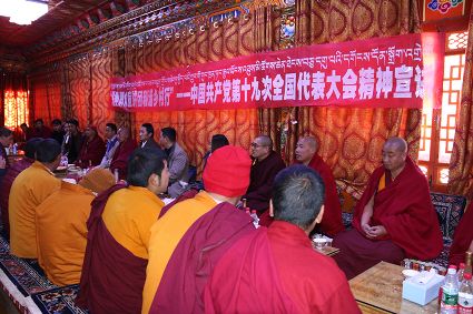 宣講團(tuán)成員勇勇用藏語激情洋溢的宣講黨的十九大精神,現(xiàn)場不斷響起熱烈的掌聲。當(dāng)勇勇講到我國五年來取得的輝煌成就時(shí),僧人們都激動(dòng)不已,紛紛為發(fā)展成就點(diǎn)贊。“聽了今天的宣講,我進(jìn)一步了解到了我們國家這些年來取得的發(fā)展成就。一直以來,黨對我們的關(guān)懷是看得見摸得著的,現(xiàn)在我們的寺廟管理越來越規(guī)范,基礎(chǔ)設(shè)施也得到了完善,通往寺廟的道路也有了明顯改善,我們的生活越來越好了,這一切都是共產(chǎn)黨的功勞。”寺廟僧人尺乃表達(dá)著對黨的感恩。