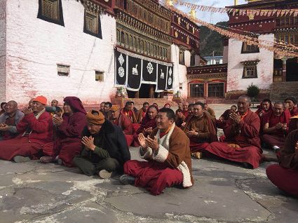 當(dāng)宣講組一行來到郭沙寺時(shí),寺廟僧人們早已迫不及待的等候在寺廟外。“聽說你們今天要來,我們?nèi)律舷露己芨吲d、很期待。”寺廟堪布甲它激動(dòng)地說。