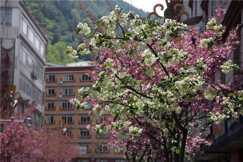 當(dāng)春天遇見(jiàn)最美的櫻花時(shí),驚艷了整個(gè)康定。櫻花與身邊人都將成為春日里的浪漫風(fēng)景。櫻花之美,美在氣勢(shì),櫻花紛飛,夢(mèng)幻唯美。每年4月中旬,康定城北門(mén)的櫻花綻放后,人們像是約好了一樣聚集到這里,共赴這一場(chǎng)甜美盛宴。這一路繁花似錦,人們穿過(guò)枝椏花正盛的櫻花林,穿過(guò)粉色海洋,徑直奔向一個(gè)浪漫的童話,一路櫻花飄散,一路粉光燦爛。櫻花絢麗繽紛、陸續(xù)綻放,若恰逢一陣春風(fēng)經(jīng)過(guò),櫻花瓣隨風(fēng)舞動(dòng),猶如紛落的雪花,空氣中浮動(dòng)著櫻花特有的淡淡香氣,令人不禁懷疑自己置身夢(mèng)境?!翱刀ǖ拇禾靵?lái)得要晚一些,綻放的櫻花,滿街的花草,折多河畔楊柳依依,康定的春天無(wú)比驚艷,醉了游人?!敝芟壬贿吪恼?,一邊感嘆,他在康定生活了40多年,20年前的康定,可以說(shuō)找不到像樣的花草樹(shù)木,進(jìn)入新時(shí)代,康定城市變美了,城市綠化走在了前面,城市的美譽(yù)度舒適度不斷提升??刀ㄖ海荷珴M園,姹紫嫣紅,風(fēng)光旖旎。