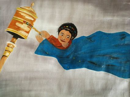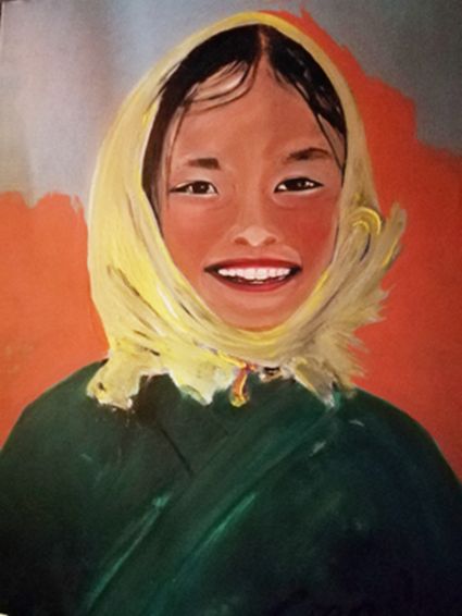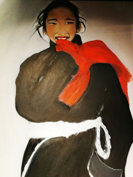 畫畫三年多了。十三歲寫詩;到了高原后,方開始創(chuàng)作長篇小說。在上海,我做過畫廊。但要說斗膽動(dòng)筆畫幅肖像。我是在白度母唐卡前燃了三炷香的。包括在咖啡店現(xiàn)場作畫。到京城繼而國外辦畫展,我認(rèn)為都是因了我把畫布當(dāng)成了詩稿的緣故。于是,大家喜歡我這種野路子,天馬行空,可又不舍方圓的創(chuàng)作手法。接下來,歐洲、東京還會(huì)有我的系列展覽。