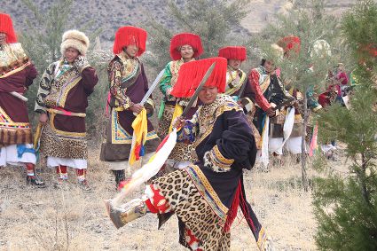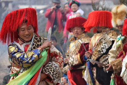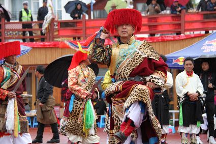 除了歌舞文化,德欽還是民俗文化最大的平臺,神山祭祀是村村寨寨必不可少的活動,在德欽,藏民對山水自然賦予了靈性,認(rèn)為自然也是和人一樣有著生命和靈性,尊重自然演繹出神山祭祀活動豐富多彩?!暗顿潯?藏語稱“百諧”。在德欽農(nóng)村,刀贊是祭祀活動的重頭戲,這一天,不亞于一個盛大的服飾表演。相傳“百諧”是古時村民為消除戰(zhàn)亂,祈福平安的一項(xiàng)傳統(tǒng)祭祀活動,延續(xù)至今已經(jīng)成為一項(xiàng)傳統(tǒng)的民俗活動?!鞍僦C”既是祭祀活動的一個儀式,也是一個獨(dú)立的傳統(tǒng)民俗活動,村里每戶一男丁在這一天必須參加“百諧”。“蘇夏”是村里男人戴的最為隆重的帽子,他不同于金邊帽和狐皮帽。長刀是“刀贊”的道具, “吉祥的日子里,我們一敬天地,賜給我們帶來幸福的生活;再敬尊敬的共產(chǎn)黨,為我們帶來平安吉祥;三敬慈祥的雙親,教會我們?nèi)绾巫鲆粋€好人……”朗朗上口的說詞伴著閃閃的刀光起舞,頗具康巴壯士的英武陽剛。
