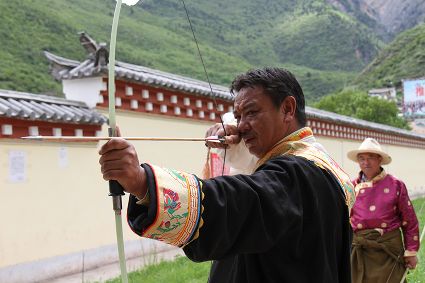 射箭也是德欽以及周邊些村落的重要民俗活動之一,村里的男人們盛裝出場,在射箭場彎弓搭箭,從7、8歲小孩到50多歲的老人都要參加射箭,甭管你射得中靶子與否,笑聲里充滿了和諧和喜慶。德欽縣的江坡村,在每年桃花盛開的季節(jié),都要開展盛大的射箭節(jié),全縣的射箭愛好者都前來一顯身手,康巴漢子們不僅射得一手好箭,還得會拉弦子,悠揚(yáng)的弦子聲可以給射手們加不少分,活動的初衷就是要求藏族男人必須能文能武。弦子聲聲,唱出了藏家百姓美好的生活,村里的女人戴上了各種金銀首飾,男人們手拉弦子,盡情歡暢的唱著、跳著,村里的老人們是忠實(shí)的觀眾,看著大家在舞場里的步子,他們也跟著笑得合不攏嘴,有些年輕人還不時跑出舞場到場邊的老人們面前請教弦子的唱詞,老人們總是不厭其煩的傾囊相授,因?yàn)樗麄冊?jīng)也是弦子舞場的“明星”。