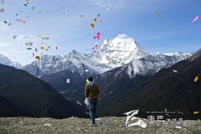 在車上,他很沉默,但當(dāng)車停靠在亞丁村口的觀景臺前時,他下了車,從懷里掏出一大疊小紙片,揚(yáng)手撒出,神色虔誠。