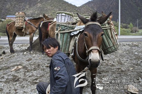 白玉縣,拉沙石的馬幫。 白玉縣,德沙村一民居內(nèi)孩子在帳篷邊玩耍。