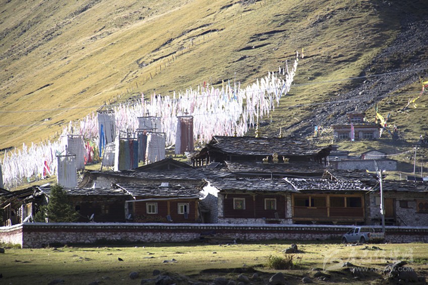 當(dāng)太陽落進金龍雪山的懷抱,最后一抹余暉斜照在靜靜的莫斯卡村莊上。東邊的小河在斜陽里歡快的流過村莊,莫斯卡的女人在夕陽里,正領(lǐng)著孩子回家。西邊牧歸的男人悠閑的向山下趕著牦牛。村莊背后漫山的經(jīng)幡,在晚風(fēng)里誦經(jīng)祈福……格薩爾王的傳說就在這樣的時光里,雕琢成了漫山的石刻,在經(jīng)年的歲月里傳頌。
