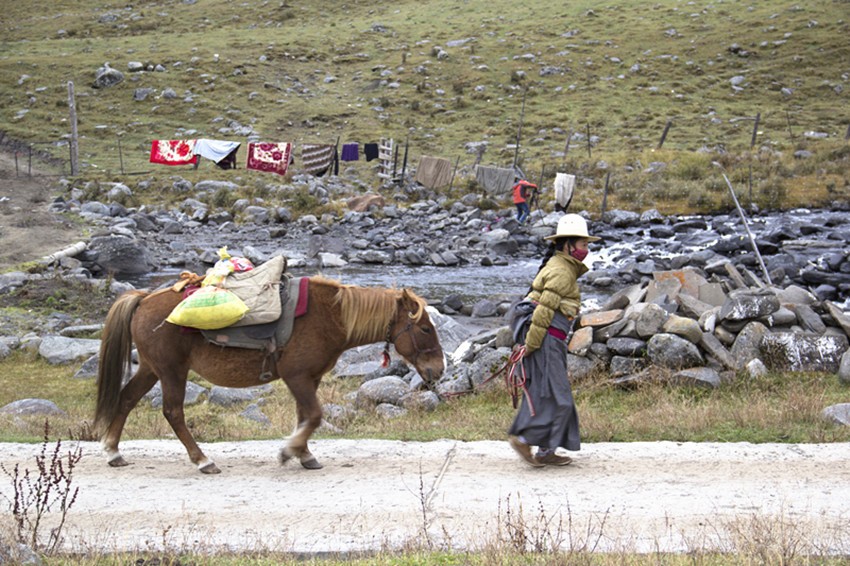 莫斯卡的女人或在寺廟點酥油燈,或帶孩子,或牽馬牧草,或在溪邊淘衣,或出門打水……她們的勤勞和樸實滋養(yǎng)著莫斯卡,滋養(yǎng)著莫斯卡的生命。她們用黑、紅、綠那樣跳躍的顏色搭配出獨具風(fēng)格的服飾,背著你遠(yuǎn)去,又迎著你走來,她們美麗的背影裝扮了寂靜的莫斯卡小巷。