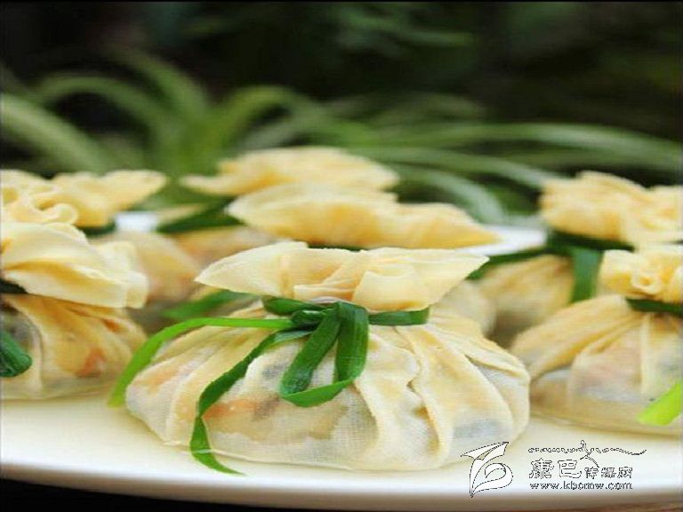 8、韭菜在熱水中燙一下,過(guò)涼開(kāi)水,系在燉好的八寶錢袋上做下裝飾即可