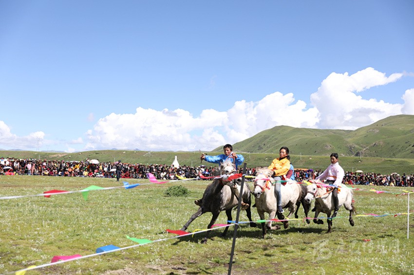 此次賽馬從馬尼干戈鎮(zhèn)馬尼村、雪柯村、洞真村、措巴村每村選出6匹壯碩的成年馬盛裝出演,圍著2000米的賽道跑完6圈,共12公里的賽程。場內(nèi)24名藏族小伙策馬奔騰,場外幾千名“觀戰(zhàn)”的看客口哨聲、叫好聲此起彼伏,不管是當?shù)氐娜罕?,還是外來的游客,置身現(xiàn)場,馬蹄聲聲伴隨歡聲笑語,馬尼干戈鎮(zhèn)分外歡騰。