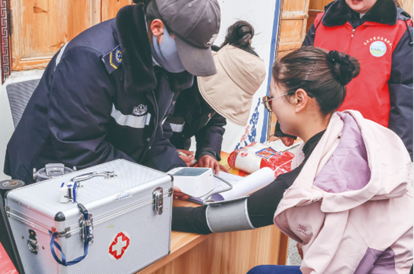 “五一”假期,理塘縣在國(guó)省干道沿線、景區(qū)景點(diǎn)設(shè)立了19處志愿服務(wù)站。每個(gè)點(diǎn)位配備黨員志愿者、醫(yī)務(wù)志愿者和文明旅游志愿者5至6名,助力營(yíng)造暖心、舒心、安心的高原旅游環(huán)境,提升游客旅游出行的體驗(yàn)感、安全感。圖為志愿者正在為游客免費(fèi)測(cè)量氧飽和度和血壓。 殷潔 葉強(qiáng)平 攝