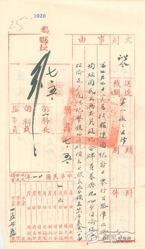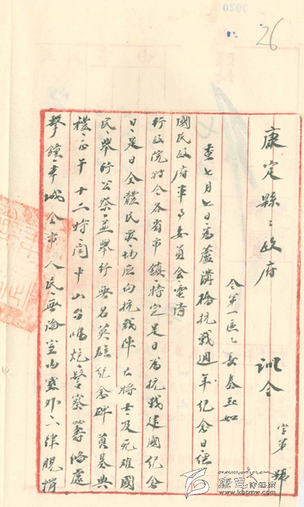 民國27年,即1838年7月5日,康定縣政府縣長杜履謙發(fā)出“訓令”,內(nèi)容如下:“查7月7日為盧溝橋抗戰(zhàn)周年紀念日,經(jīng)民國政府軍事委員會電請行政院特令各省市、鎮(zhèn):特定是日為抗戰(zhàn)建國紀念日。是日全體民眾均應(yīng)向抗戰(zhàn)陣亡將士及死難國民舉行公祭,并舉行無名英雄紀念碑奠基典禮。正午12時,聞中山臺鳴炮,警察籌備處擊鐘,本城全市民,無論室內(nèi)室外,一律脫帽立正默哀五分鐘。禁止屠宰,素食一日。此令”。