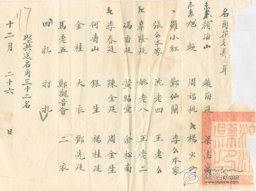 不準(zhǔn)賭博做什么呢?當(dāng)時(shí)的當(dāng)權(quán)者還是費(fèi)了一番心思,他們從外地請(qǐng)來(lái)了一個(gè)川戲班子,為了吸引人們關(guān)注,康定縣政府把戲班的名角以及配角演員名單寫成海報(bào)張貼到街頭,又抄成傳單廣為散發(fā),用現(xiàn)在的話說(shuō)是,做足了戲班出場(chǎng)前的前期宣傳工作。從名單上看,這是一個(gè)不小的戲班子,所謂名角竟有32名之多。想來(lái)對(duì)于沒(méi)有多少文化生活的康定民眾,還是有一定的吸引力。