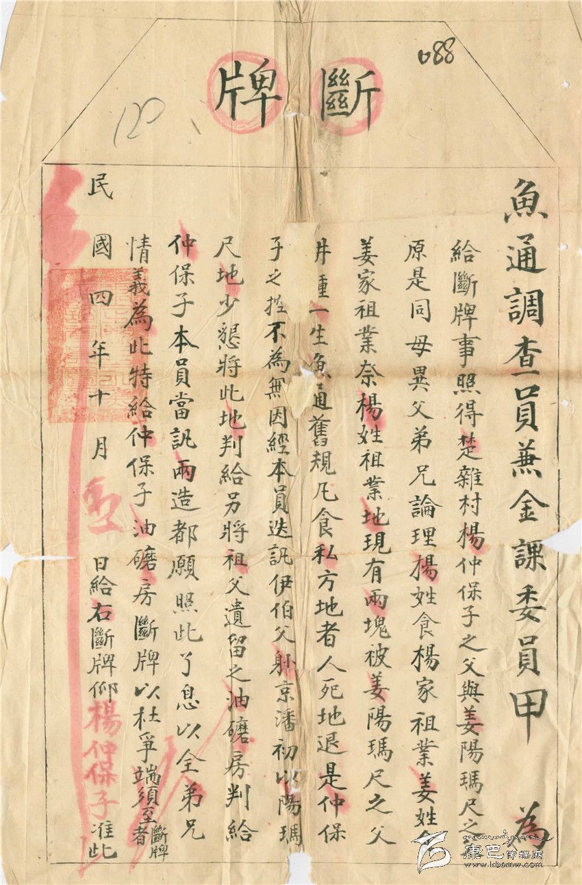 這張“斷牌”說的事情發(fā)生在“民國4年”(公元1915年),用今天的眼光來看應算是一件“民事糾紛”。在一處地名“楚雜村”的地方,一個叫“楊仲保子”的人和一個叫“姜陽瑪尺”的人因為耕地所有權(quán)的事發(fā)生了糾紛。這兩個人其實是同母異父的兄弟。為了平息兩個人之間糾紛,也是為了保全兄弟情誼,又從公平角度出發(fā),甲調(diào)查員就把一處“油磨房”斷給“楊”姓所有。事情就這么斷了,為了防止以后再為這事發(fā)生糾葛,甲安仁調(diào)查員就發(fā)出了這樣一張可以作為“憑證”,其實是在當年的那種情形下具有法律效力的“證書”。