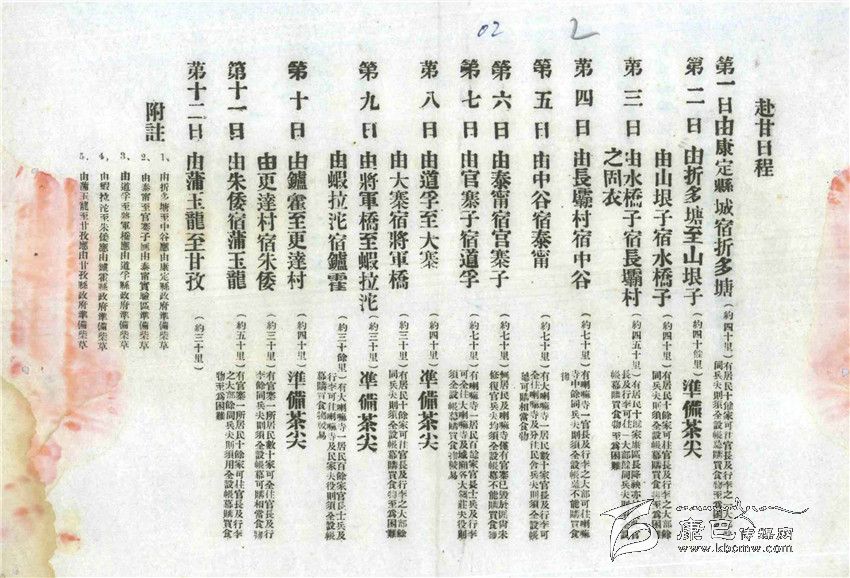 為了安排好戴院長一行的行程,西康建省委員會專門發(fā)出了一份“訓令”。這份時間表就是根據(jù)“訓令”要求為戴院長行程作出的安排。每天從何地到達何地,里程多少,休息地有無村莊、寺廟,接待力量如何、是進房屋休息還是支帳篷都有說明,而且對沿途各縣各地提出了包括應(yīng)準備柴草、應(yīng)在哪些地方準備“打尖茶”(午飯)等具體要求。