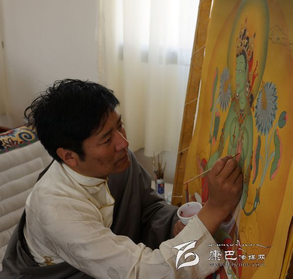 離開了傳統(tǒng)文化就如同失去了藝術(shù)創(chuàng)造的根基,脫離了公眾審美情趣也就意味著失去了未來發(fā)展的方向。他堅(jiān)持以“拉姆拉綽唐卡畫院”為基地,在廣泛汲取傳統(tǒng)文化“營養(yǎng)”的基礎(chǔ)上,與其他畫師一道嘗試整合唐卡流派,發(fā)展噶瑪嘎止繪畫的材料技法,將世俗內(nèi)容納入唐卡創(chuàng)作的范圍之中,并在形式上大膽追求優(yōu)美高貴、色彩明亮、造型大方的藝術(shù)特色,試圖能夠?qū)ふ业揭环N新的創(chuàng)作出路。
