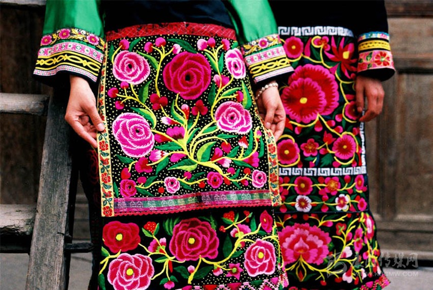 平常,魚(yú)通女性身著青布長(zhǎng)衫,頭頂同色系列的帕子。節(jié)日盛裝時(shí),以青藍(lán)長(zhǎng)衫打底,并配以繡有花朵圖案的圍裙和頭帕。經(jīng)過(guò)這樣的點(diǎn)綴,女性的柔美與嫵媚被展示得恰到好處。然而,這些作品所被賦予的,并不僅僅是勻稱(chēng)的力道,細(xì)密的針腳,以及大膽的配色,同樣,也摻雜著與之息息相關(guān)的生活,穿梭在流水般的日子當(dāng)中,每一針每一線(xiàn)都被細(xì)細(xì)打磨,長(zhǎng)期勞動(dòng),真實(shí)面目逐漸呈現(xiàn)。這些作品,在歲月的磨礪中被糅合,經(jīng)得住任何挑剔的品味。