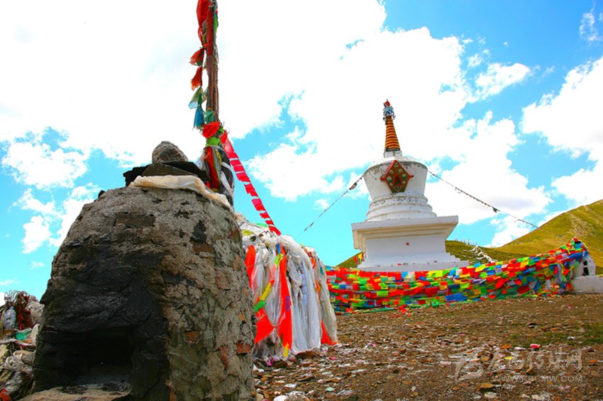 藏族幾乎全民信仰藏傳佛教。折多山上下四周,山頂河谷到處飄揚著五色經(jīng)幡,或者印以文字,或者繪以圖案。經(jīng)幡五色,依次是藍、白、紅、綠、黃,藍色象征藍天,白色象征白云,紅色象征火焰,綠色象征綠水,黃色象征大地。五種顏色代表生命賴以存在的基礎。世代生活在高原上的人們對大自然的變化尤其敏感,故企盼大自然風調(diào)雨順,人間太平幸福。佛教慰藉了他們的靈魂,經(jīng)幡寄托了他們的希望。