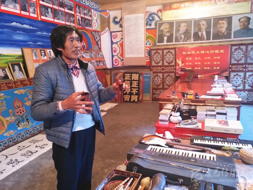 到了九龍,記者幾次打算采訪呷爾鎮(zhèn)原文化站站長王長生。王長生,人稱王老表。65歲的王長生本該退休在家安享晚年,然而,作為九龍乃至甘孜州的文化名人以及他在開展群眾工作方面的建樹,退休后,他依舊是個大忙人,黨的十九大勝利召開后,作為省級優(yōu)秀宣講員,為了搞好宣講,他潛心備課,黨的十九大精神宣講全面鋪開后,他與宣講團成員一道奔赴瀘定、丹巴、雅江、九龍等縣農牧區(qū)宣講。12月12日,他忙里偷閑,在美觀整潔的家里接受了記者的采訪,多才多藝的王長生向記者展示了他高超的才藝。