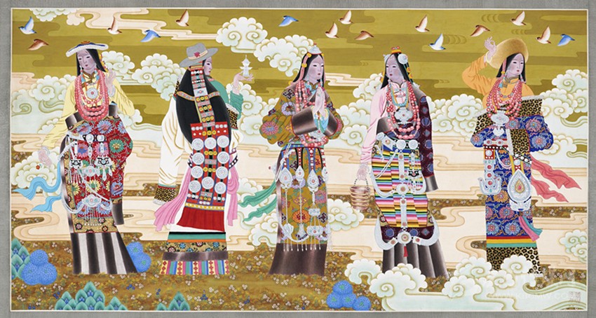 青藏高原有著曠遠弘大的人文地理,有著神秘久遠的宗教文化傳承,正是這蒼茫大地孕育了藏族人;正是這片極度追求審美體驗并把生活高度藝術(shù)化的疆域,滋養(yǎng)了西藏藝術(shù)。從早期的巖畫、旗幡畫、唐卡、壁畫,再到當代的丹青重彩,無不生發(fā)于這片神奇高原,皆是中華民族文化寶庫中燦爛的牟尼寶珠。唐卡繪畫肇啟于松贊干布隆興之時,向南學(xué)習(xí)印度、尼泊爾布畫,往西受到犍陀羅藝術(shù)浸潤,向東融合唐、宋、明、清之審美,再集藏地宗教文化、民族審美熔為一爐,鑄就一千三百年唐卡繪畫之法脈。它不僅是獨具魅力的藏文化之血脈源流,更是各民族文化交融、和諧互生的典范,對世界藝術(shù)有著深遠的影響。