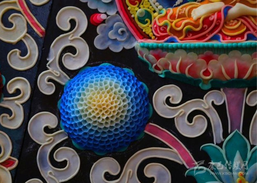 在青海塔爾寺,有一座酥油花館,陳列著僧人們巧手創(chuàng)作的多姿多彩的酥油花。它與堆繡、壁畫和磚雕一起,被譽為塔爾寺“四絕”。