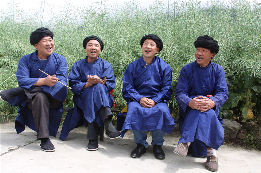 還未走進農家小院便聽見院落里傳來笑聲,笑聲爽朗且渾厚。走進院落,“葉子煙”(當?shù)厝俗灾频囊环N土煙)的香味彌漫在空氣中,四位頭裹黑布裝飾、身著藍色長袍的阿哥坐在槐樹下談笑風生。得知記者的來意,為首的阿哥將煙桿在鞋底敲了敲,熄滅煙火,便徑直走向堂屋里去了。不搭腔、不搭調的離開,這讓記者感到措手不及,正要喚他出來,他卻手捧自家屋里種的水果,熱情地和記者打起了招呼:“我們四個就是村里唱‘十二杯子酒’酒歌的人,就是圖個熱鬧,要聽‘十二杯子酒’,就得喝我們這里的土酒,今天沒有準備美酒,以水果帶酒招待遠方來的貴客,吃完水果咱們再來擺談?!?/p>