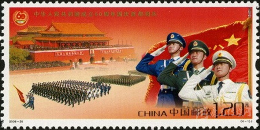 2009年10月1日,中國郵政發(fā)行的《中華人民共和國成立60周年國慶首都閱兵》紀念郵票一套4枚。其中第1枚“徒步方隊”(圖6),圖案為中國人民解放軍三軍儀仗隊執(zhí)旗手和護旗手在軍旗下行軍禮。