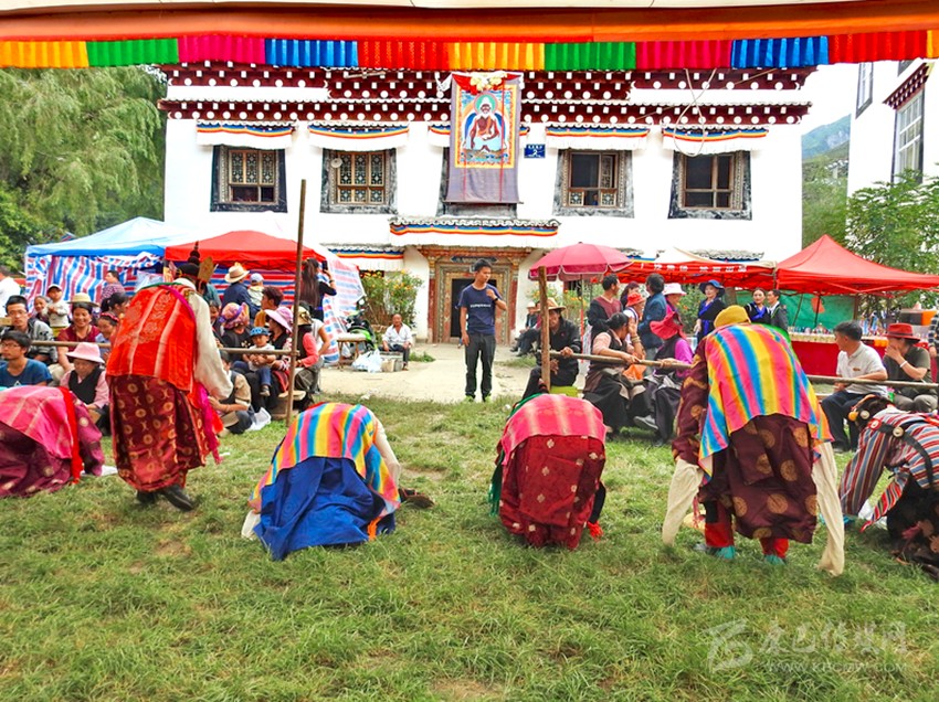 初次看到巴塘藏戲是康巴衛(wèi)視藏歷春晚,原以為是寺廟舞蹈,在唱聲杳杳里類似川劇的喉腔讓我覺得新奇,于是找些資料看看了巴塘藏戲介紹。藏戲的開山鼻祖唐東杰布。藏民歷來把他看作是創(chuàng)造藏戲的戲神和修建橋梁的鐵木工匠的“祖師”,是藏族人民心目中智慧、力量的化身。他將佛教經(jīng)典中的傳記同民間傳說、神話故事等內(nèi)容融在一起,創(chuàng)作出一種具有人物性格和舞蹈、唱腔相結(jié)合的表演藝術(shù),使過去單一的跳神舞逐漸地戲劇化,表現(xiàn)手段也不斷加強,并從宗教儀式中分離出來,形成了藏劇藝術(shù)的雛形。