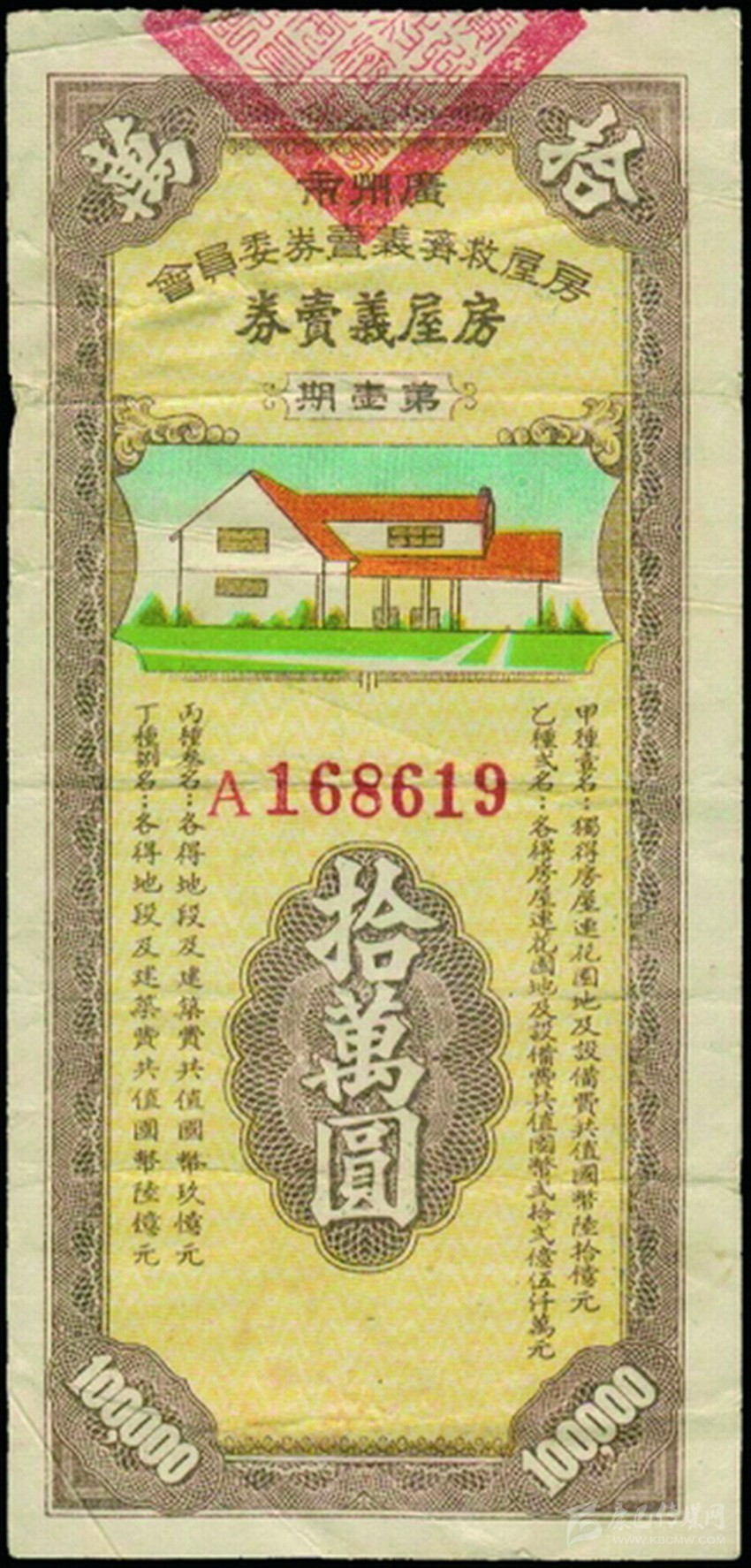 1948年2月,廣州市房屋救濟義賣券委員會每月發(fā)行一次房屋義賣券。第一期房屋義賣券面值10萬元,共發(fā)行30萬張。設(shè)甲、乙、丙、丁種中獎?wù)吒?、2、3、8名,其中甲種獨得房屋連花園地及設(shè)備費共值國幣六十億元,乙種各得房屋連花園地及設(shè)備費共值國幣二十二億元五千萬元,丙種和丁種得土地及建筑費分別值九億元、六億元。第二期房屋義賣券仍發(fā)行30萬張,但每張面額上升到國幣20萬元,獎項變?yōu)橹歇務(wù)呒追N1名,獨得房屋兩間及設(shè)備費十億元;乙種2名,各得房屋兩間;丙種3名,各得房屋一間另設(shè)備費五億元;丁種4名,各得房一間。