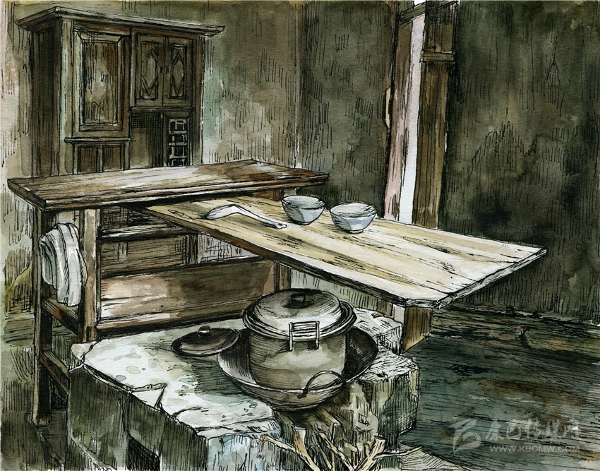 在我們家,灶屋里砌著一個四方形兩灶孔的大正灶,兩條寬板長凳靠墻擺放,交于墻角,像木匠的大曲尺,半圍著象征一家之主的正灶,其中一條正對著灶門口。灶與凳之間的通道,僅容曲膝而坐。灶上常年擱著烏黑的鼎灌和鐵鍋,灶的背面則立著一張長條狀的灶桌。灶桌是洗碗和切菜的地方,在其橫長的縫隙里插上接手板,懸空于灶面之上,擺上碗筷,又起到了飯桌的功能。灶屋進門的另一面墻,靠墻而立的,是高高的碗欃和一個瓦水缸。碗欃是平素放碗放剩菜的地方,本是漆了老紅色,卻因西墻的木格窗小,光線幽暗,與四壁及樓板的烏黑融為了一體。水缸上口有一塊擱板,板上放兩只寬口瓦缽,缽里各放著一只竹筒水勺,一大一小。每天早晚,家人擔了木桶,挑來井水倒入水缸,此處的地面,長年潮濕。灶屋是我們一日三餐吃飯喝茶休息閑談的場所,煙火歲月,多是在此度過。我開蒙上小學后,每到夜晚,吃過飯后,將煤油燈盞移到寬板長凳,雙膝跪地,伏在凳灶之間的空隙里寫作業(yè),有時一不小心,額前頭發(fā)就被燈盞的火焰燒得焦臭。我自小愛學習,成績很好,每學期都有獎狀,老師夜里來村間家訪時,也常來我家坐,是我父母最大的榮光。