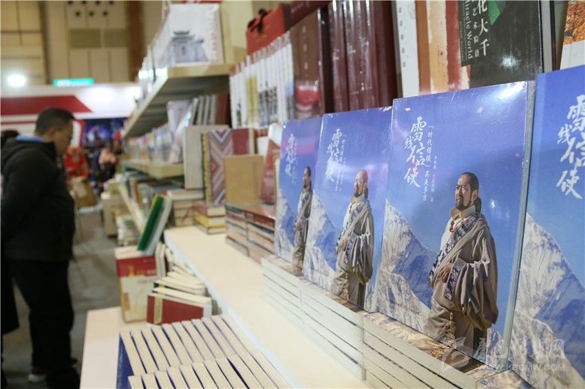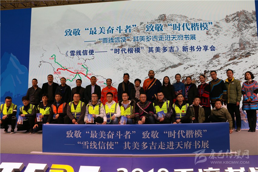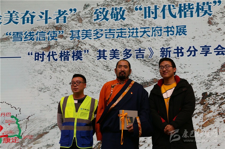 在分享會(huì)舞臺的一側(cè),靜置著書籍《雪線信使——“時(shí)代楷模”其美多吉》放大后的封面。封面上,其美多吉、藍(lán)天與雪山相得益彰,構(gòu)成了一幅獨(dú)具特色的畫面。