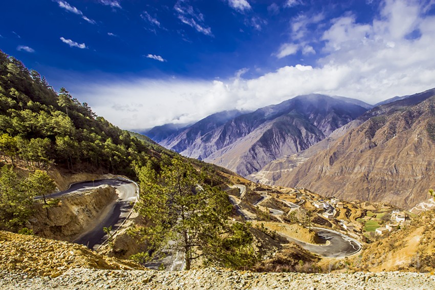 如今,所有鄉(xiāng)村通了硬化路,橫跨在金沙江上的十余座跨江大橋氣貫如虹,天塹變通途。過去我們下鄉(xiāng)時,從日雨到曲雅貢,只有一條從因都壩背后的半山腰路。蒼茫大山,路上幾乎看不見一顆大樹,也找不到一滴水源。從山腰看江畔的因都壩,只有兩戶人家,幾株綠樹總令焦渴難耐的我們望“綠”興嘆!下山走到金沙江邊,熾烈陽光從河灘上反射,火辣辣照在臉龐和皮膚,熱浪令人窒息,感覺目的地遙不可及?,F(xiàn)今,干部下村完全不需要走路,走路下鄉(xiāng)對年輕人來說簡直不可思議。公路像一條飄帶環(huán)繞山間,使散落在峽谷中的村寨愈發(fā)展現(xiàn)出欣欣向榮的新風(fēng)貌。
