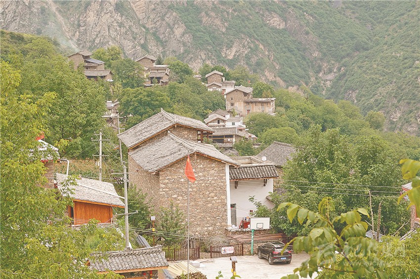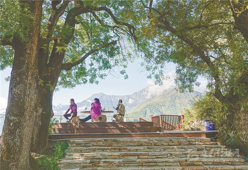 但那時(shí)如細(xì)索一樣盤繞在陡峻坡崖間的山路牢牢地拴住了山民的腳。多少年過去了,老樹尚在,世事卻變化得讓人難以置信。眼下的貢安山梁上正在建造一座數(shù)層高的觀景高樓,這極可能成為麥崩山鄉(xiāng)新的“地標(biāo)”。尚未峻工的觀景樓臺(tái)右側(cè),沿起伏的山梁已修筑兩公里長的步游廊道,野花簇?fù)恚鸱琮?。山堡里民居接待、亭院廊樓、果樹花臺(tái)夾雜于坡地綠叢間,時(shí)不時(shí)有外地旅游觀光小車沿新筑的水泥公路駛?cè)肷奖?,已具現(xiàn)代旅游商業(yè)化的規(guī)模。