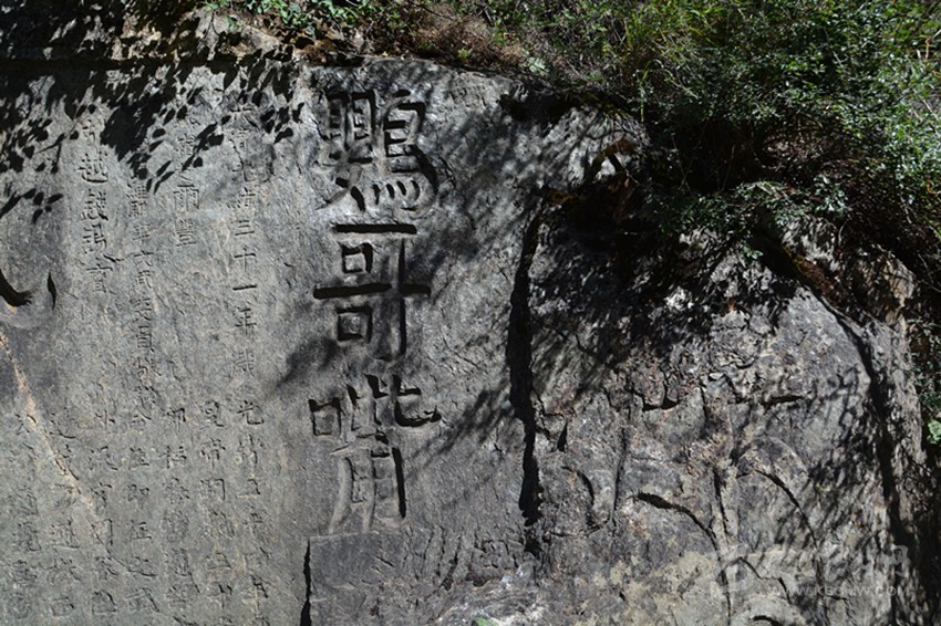 《竺國(guó)通衢》刻在一顆大石頭的下部,石高約三米,長(zhǎng)約六米,刻于清道光年間,意為通向印度的通道,充分說(shuō)明這條道路的價(jià)值和作用。大石和字已藏在核桃樹下,勢(shì)大必難除,加之雨水侵蝕下已風(fēng)化嚴(yán)重。