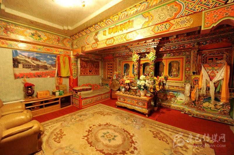 藏族居室一般分臥室、客廳、經(jīng)堂和廚房等部分。室內(nèi)陳設(shè)與裝飾如藏式建筑學者葉啟燊所言:“主次分明,重點突出。主室較為復雜而樸素,經(jīng)堂偏于華麗而清幽,其余各室均較簡單。室內(nèi)都不施粉刷,但有個別的經(jīng)堂作雕刻裝飾;土司和喇嘛上層的經(jīng)堂則會作油漆的彩畫?!辈貐^(qū)不論是農(nóng)牧民住宅還是貴族上層府邸都有供佛的設(shè)施,經(jīng)堂屬于凈地,是專門供奉神佛的,因此,一般不作他用;主室是藏族住宅中最重要的一個房間,也是功能最多的房間,其中有生活、睡眠、飲食等所需的爐灶、壁櫥、壁架、矮桌、火盆等。這些藏式家具的布置安放,早已形成一定之規(guī)。