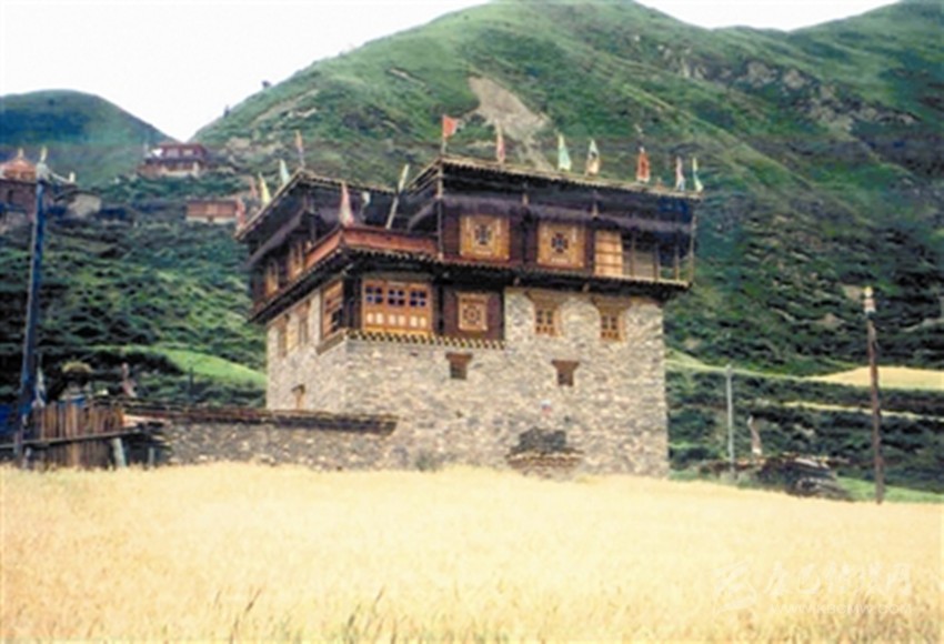 色爾壩藏寨以石頭、泥土、木頭為主要建筑原材料,絕不用水泥、鋼材等現(xiàn)代建材,甚至屋頂也不用瓦片,全部采用泥土,取材十分簡單、方便,然而因?yàn)樾藿ㄈ咳斯ぃて谳^長,需要2-4個(gè)月或更長時(shí)間。當(dāng)?shù)赝诵莞刹控晠s秋告訴筆者,藏寨房屋層數(shù)有較嚴(yán)格的規(guī)定,普遍為3—4層,不少于3層,也不會(huì)高于4層,分別象征一個(gè)人的頭部、胸部、腹部和腿;底層一般用來關(guān)牲畜或堆放雜物,第二層存貯糧食,第三層居住,第四層設(shè)置佛堂,這種建筑風(fēng)格不同于周邊爐霍、道孚、丹巴民居,自成一體。藏寨造型完全擬人化,外形奇特,上大下小呈倒立的品字形,猶如一個(gè)頭戴盔甲、身披戰(zhàn)袍的將軍;房屋上層樓廊外部均以高山柳條垂掛環(huán)繞,以象征大將色爾哇·尼崩達(dá)雅的披肩長發(fā);房頂正中的小旗幟就象將士頭盔上的帽纓;房屋右側(cè)隨風(fēng)飄拂的經(jīng)幡,恰似將軍手握長矛在沖鋒陷陣。房屋依山而建,傍山而立,外形高大雄偉。深厚的格薩爾文化為藏寨蒙上了一層神秘的面紗。