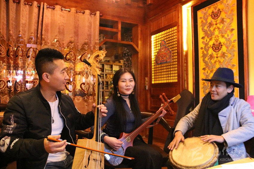 其美(中)和朋友交流樂(lè)器使用技巧。