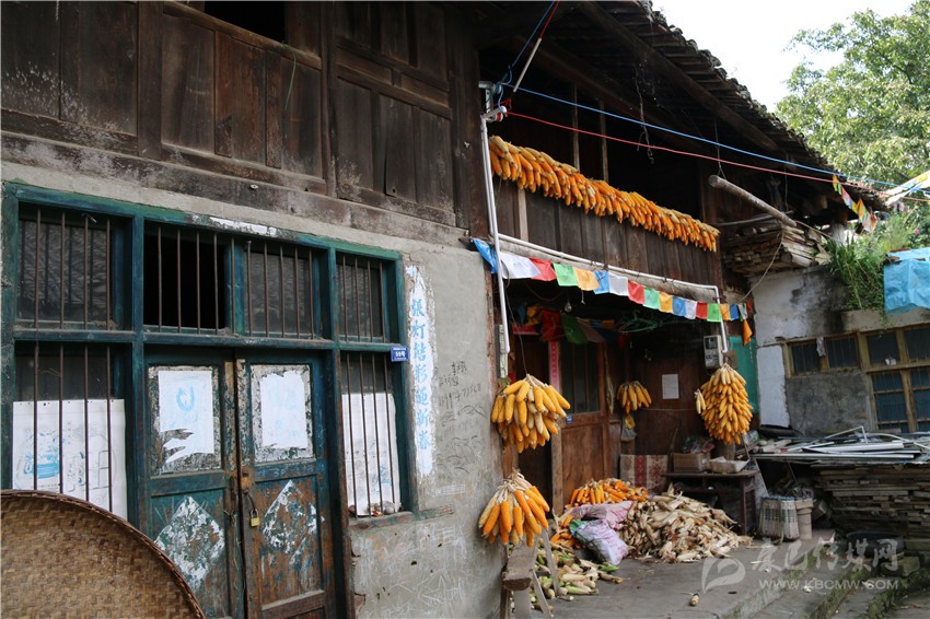 “這算是原生態(tài)的土司房了”,穿過小道,董老指著一間木板房;“是的,不過它的危險(xiǎn)系數(shù)很高?!庇嗳A應(yīng)道。近看,門窗屋檐做工精細(xì),散發(fā)著古樸感,但也不難發(fā)現(xiàn)屋身的“補(bǔ)丁”;后退兩步觀望,整個(gè)屋身稍傾斜,是典型的危房。繼續(xù)行走,是泥土和木板結(jié)構(gòu)的房屋,這也是上衙門遺址最后一站。據(jù)董老講述,這里是土司老爺審人的地方,犯人就跪在門坎的大石階上。不過,金黃玉米與鋼筋門窗的出現(xiàn),很難讓人想象土司老爺在該地審案的景象。