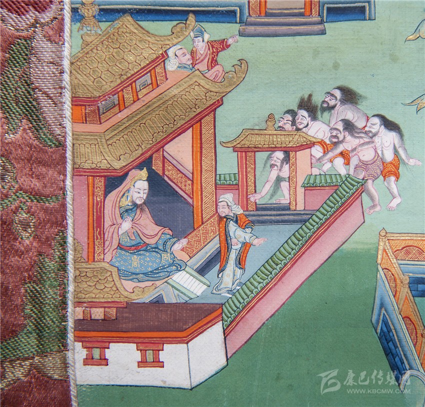 再看《如意寶藤》的另一個局部,對比唐卡裱邊,我們可以看出大約十公分見方的畫面里,郎卡杰描繪了十個人物和一棟宮殿,畫面還顯得很疏朗;圍墻外的“邪魔外道”身上不僅分染了體積,還描繪了五官須眉和汗毛。漢式宮殿內(nèi)外墻磚上,還刻畫了精微的花紋和裝飾,郎卡杰的“神變”畫技由此可見。而這樣的微型畫中畫,在郎卡杰作品中大量存在,精彩絕倫。圖二《如意寶藤》局部