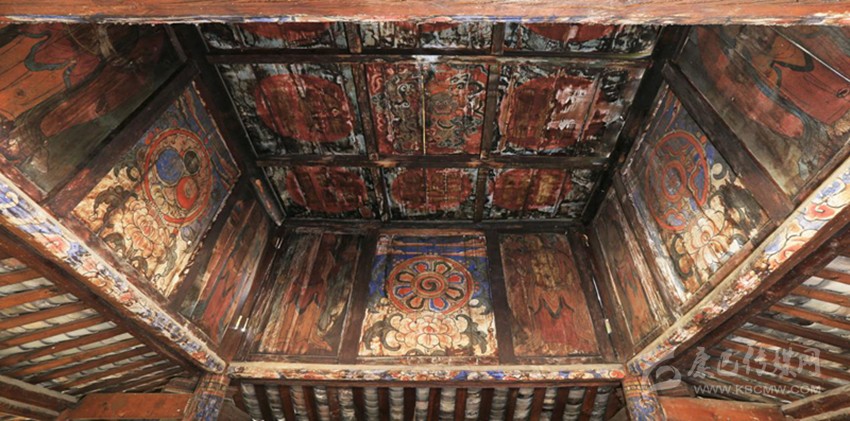 在介紹的過(guò)程中,我發(fā)現(xiàn)這座小寺不簡(jiǎn)單,很想到正殿看看。到了殿里,我發(fā)現(xiàn)殿內(nèi)佛像具備,壁畫(huà)、板畫(huà)以及唐卡數(shù)量眾多,皆是工藝精湛。廟宇四檐有青銅制風(fēng)鈴4個(gè),但是一樓的壁畫(huà)看著像是維修過(guò)。