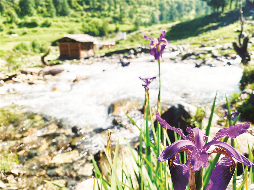 我走出木屋,朝著流動(dòng)的水聲去梳洗。三兩只藍(lán)綠色的鳥(niǎo)兒立在插入溪水溝里的一截木槽上低頭飲水,抬頭鳴唱,見(jiàn)到人影,撲棱棱幾聲飛進(jìn)了不遠(yuǎn)處的一片淺樹(shù)叢里,沒(méi)了蹤跡。一層薄薄的白霧正從牧場(chǎng)后方皺褶起伏的山頂漫溢下來(lái),湮沒(méi)了黛青色的山石、綠色的小杜鵑樹(shù)叢,接著湮沒(méi)了整個(gè)牧場(chǎng),眼前一片空茫,耳邊只有溪水婉轉(zhuǎn)流向遠(yuǎn)處的聲音。我蹲下身,把手伸進(jìn)溪水里,由雪水融化的沁涼很快冷冽到了骨頭里,再往深處,觸摸到一個(gè)個(gè)光滑的圓石。浸泡久了,溪水開(kāi)始變得柔軟溫暖起來(lái),掬一捧洗臉,那清爽仿佛能使我一眼看開(kāi)眼前的云霧,看清那些停立于山頂石礫之上的灰色獐子和樹(shù)叢深處悄然綻開(kāi)的紫色貝母花,花瓣上星星點(diǎn)點(diǎn)的白是它與生俱來(lái)的喜色。