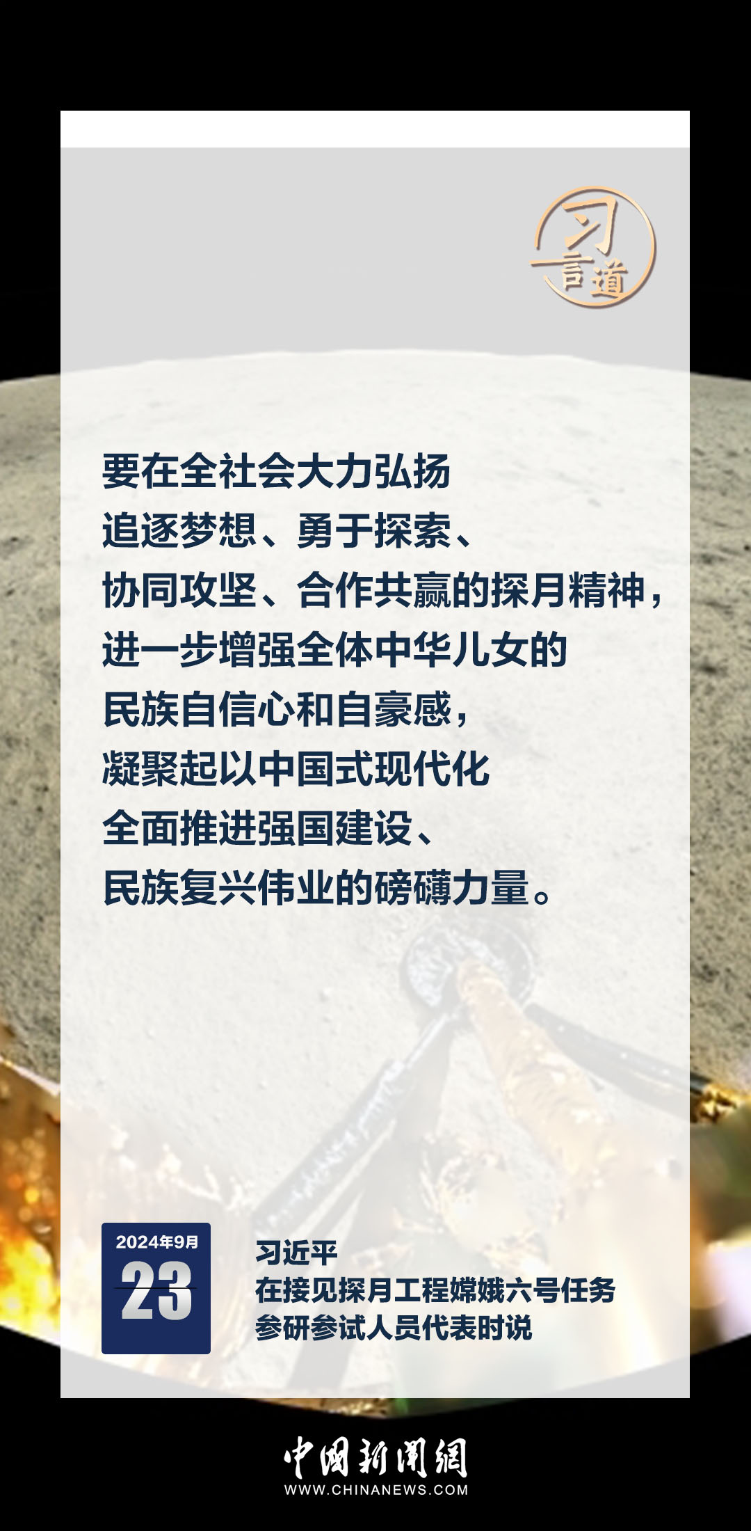 中共中央總書記、國家主席、中央軍委主席習(xí)近平23日在人民大會(huì)堂接見探月工程嫦娥六號任務(wù)參研參試人員代表時(shí)發(fā)表重要講話。習(xí)近平指出——