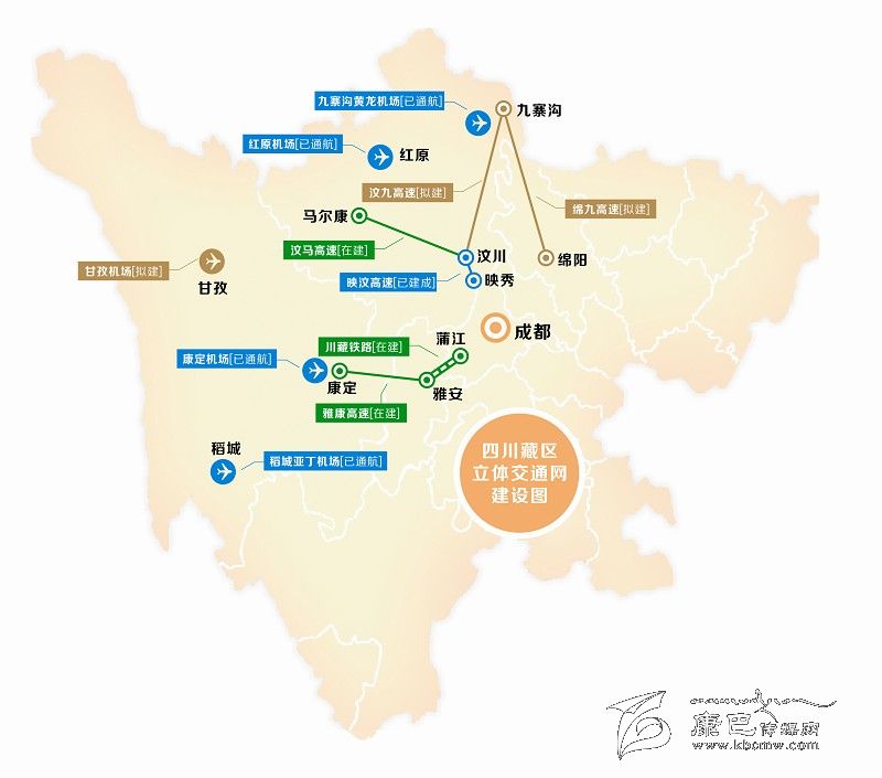 上月出臺的《四川省推進實施長江經(jīng)濟帶綜合立體交通走廊規(guī)劃工作方案》中提出,我省將加快支線機場建設(shè),包括進一步完善位于四川藏區(qū)的紅原機場配套設(shè)施,以及將在“十三五”期間,開工建設(shè)同樣位于藏區(qū)的甘孜機場。鐵路方面也有好消息,備受關(guān)注的川藏鐵路,除了剛剛?cè)€開工的蒲江至雅安段外,還將在明年上馬建設(shè)雅安至康定(新都橋)段。