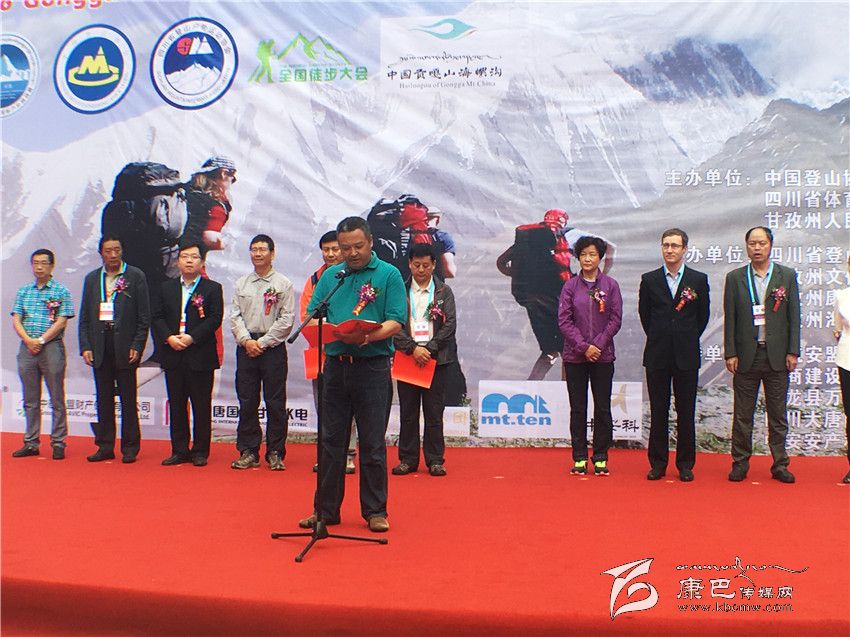 開(kāi)幕式上,四川省體育局副局長(zhǎng)蔣顯倫為2016中國(guó)•甘孜環(huán)貢嘎山百公里國(guó)際山地戶(hù)外運(yùn)動(dòng)挑戰(zhàn)賽暨徒步大會(huì)作致辭。