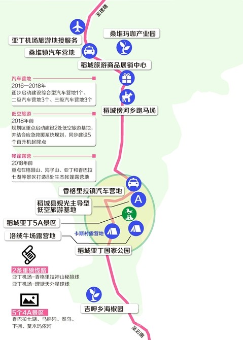 根據《規(guī)劃》,將結合道路交通和旅游景區(qū)景點分布,2016—2018年,逐步啟動建設綜合型汽車營地1個、二級汽車營地3個、三級汽車營地3個,作為建設環(huán)亞丁兩小時旅游圈的重要旅游項目,滿足日益增長的自駕車游客需求。